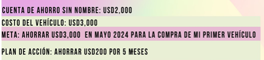Para tener esto un poquito más claro les brindaré otro ejemplo, porque no sé ustedes, pero yo entiendo mejor con ejemplos. Supongamos que este año quieres que sea el año de tener tu propio vehículo porque en este 2025 entraste con pilas nuevas. Te detienes y piensas que quieres tenerlo para tu cumpleaños que es en mayo… Luego de pensar un poco más, porque obviamente mayo está muy cerca como para empezar desde cero; recuerdas que tu fondo de emergencia está completo y tienes un dinerito extra en una cuenta que aún no le tenías destino; porque eres de esas que guarda dinero sin un nombre. Con esto en mente, planteemos el siguiente escenario: