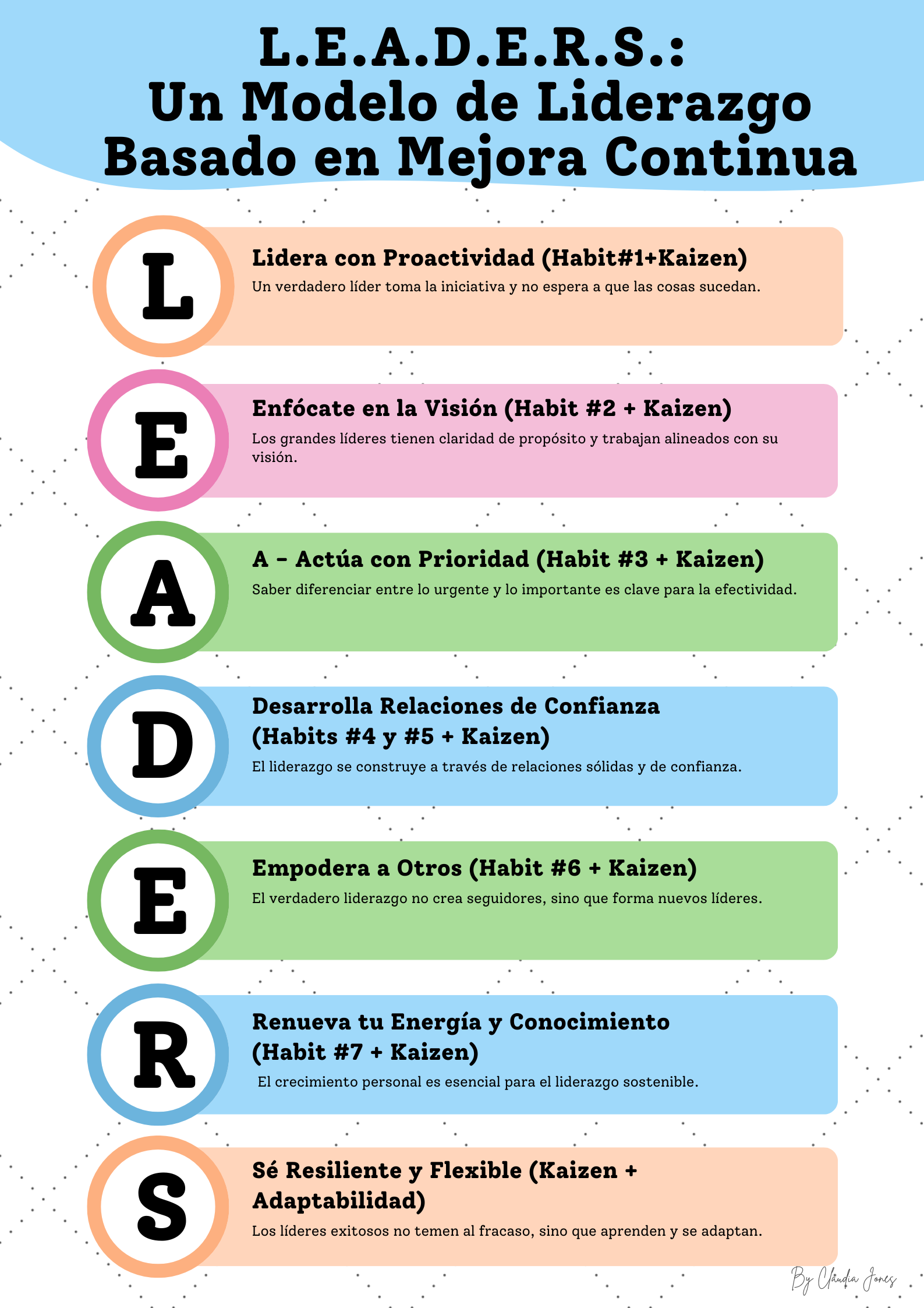 El liderazgo no es un don con el que se nace, sino una habilidad que se desarrolla con disciplina, hábitos efectivos y un enfoque en la mejora continua. La Dra. Claudia Jones ha diseñado el modelo L.E.A.D.E.R.S. como una herramienta práctica para guiar a líderes en su camino hacia la excelencia. Inspirado en los principios de Stephen Covey y la filosofía Kaizen, este método busca potenciar el liderazgo mediante acciones progresivas y sostenibles.