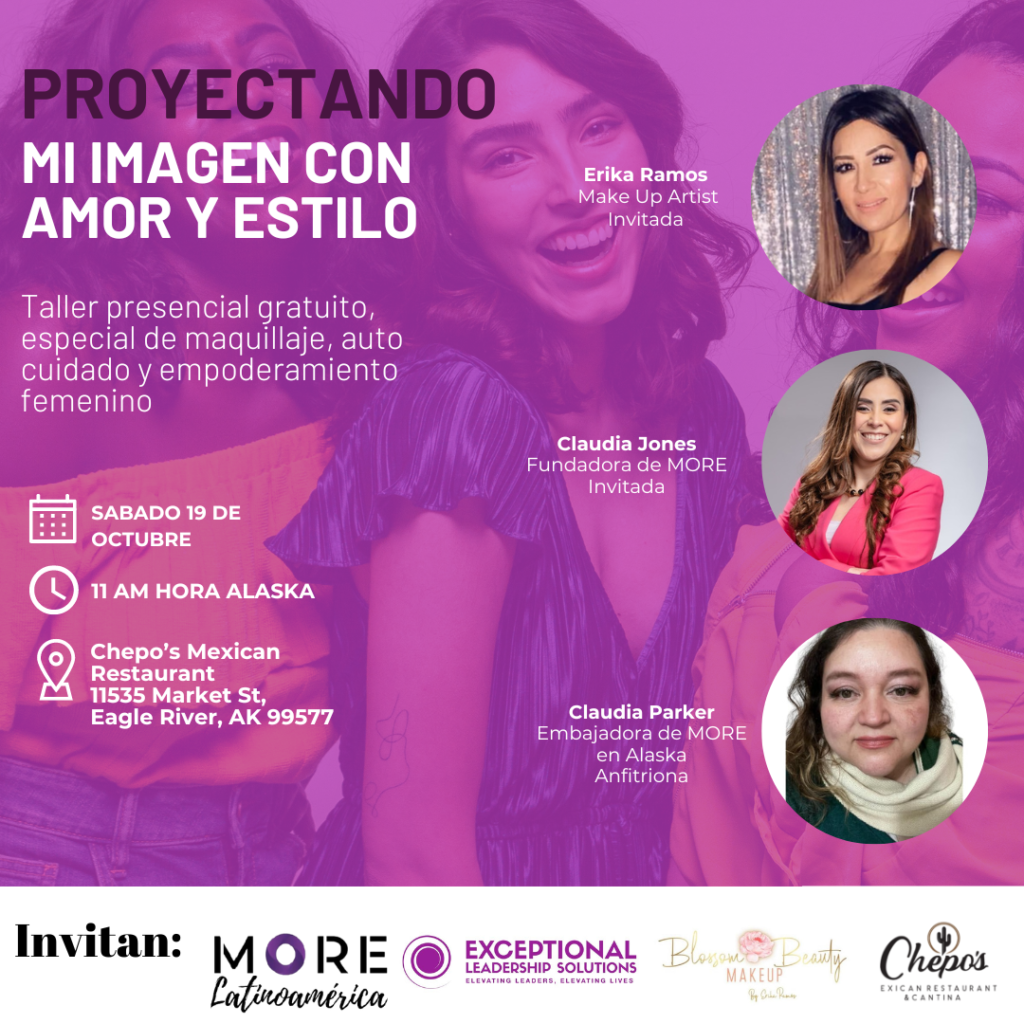 El 19 de octubre se llevó a cabo el taller “Proyectando mi imagen con amor y estilo” en Eagle River, reuniendo a 20 invitadas en el restaurante Chepo’s. Este evento fue un espacio de inspiración y empoderamiento, con la participación destacadas mujeres. Claudia Parker, Embajadora de Alaska, lideró la dinámica inicial compartiendo estrategias para reflejar confianza. La Make Up Artist Erika Ramos ofreció consejos sobre maquillaje y estilo, resaltando la importancia de expresar autenticidad a través de la imagen personal. Claudia Jones, fundadora de More Latinoamérica, presentó la charla «Propósito de vida», motivando a las asistentes a conectar con su misión personal y profesional. Fue una jornada íntima y enriquecedora, donde cada participante se llevó herramientas prácticas para proyectar amor propio y autenticidad en su día a día, reforzando su identidad con estilo. Chepo’s ofreció un ambiente cálido y acogedor, creando el entorno perfecto para este encuentro transformador.Agradecemos a todo el equipo de Colaboradoras que estan en Alaska, por apoyar y hacer este evento posible.